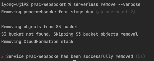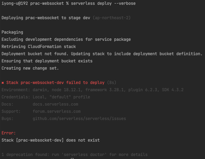 Nest.js 프로젝트의 코드 작업을 마무리하고, serverless.yml 파일에 정의된 속성값들을 수정하여 Lambda의 경량화를 진행하고 있던 와중 Service를 AWS Lambda에 배포하려 할 때, Stack prac-websocket-dev failed to deploy 라는 에러가 발생하였다.