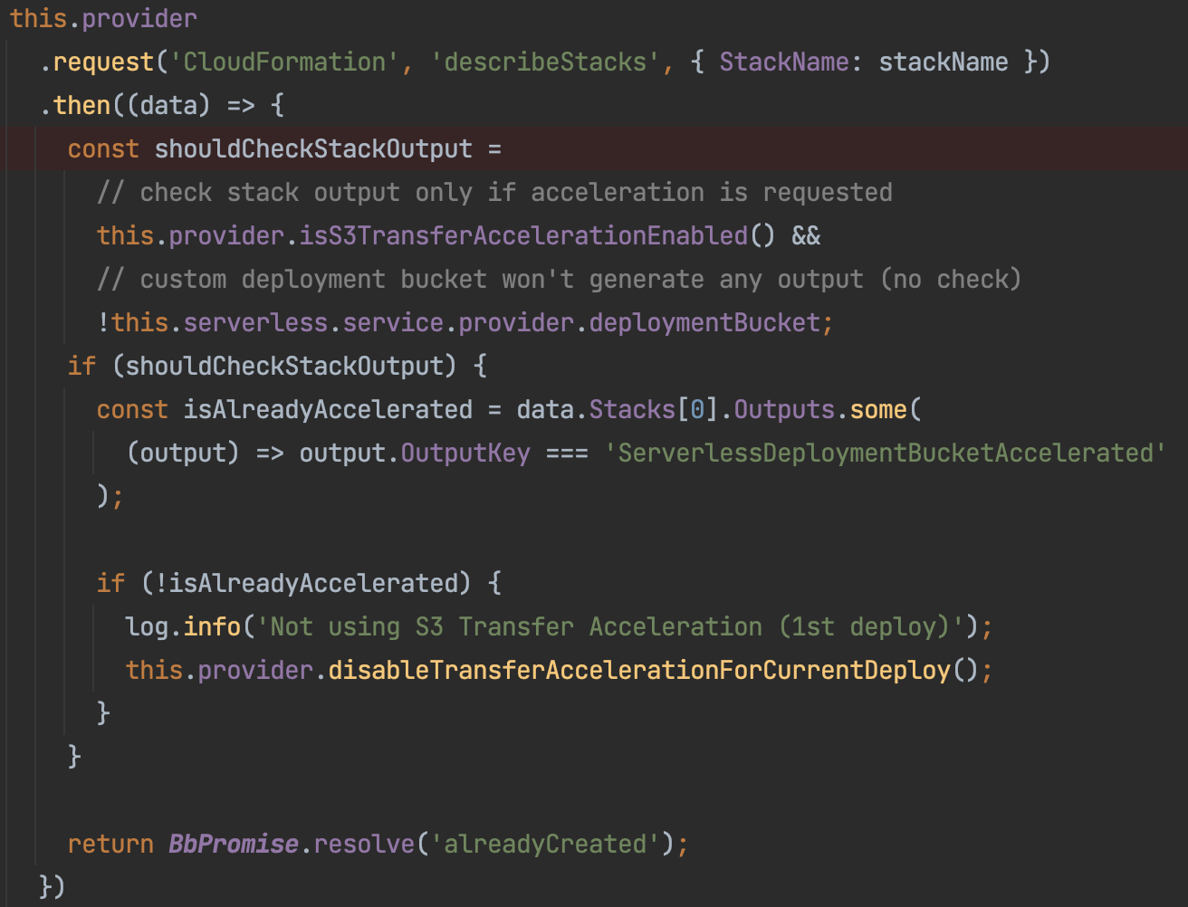디버그 로그에서 확인할 수 있듯이 “Stack … does not exist” 에러가 발생하기 전 가장 마지막에 실행되는 Hook은 “aws:deploy:deploy:createStack”이다. Hook의 <MAIN_EVENT>에서 유추할 수 있듯이 AwsDeploy Class의 createStack 메서드에서 처리되는 것을 확인할 수 있다.