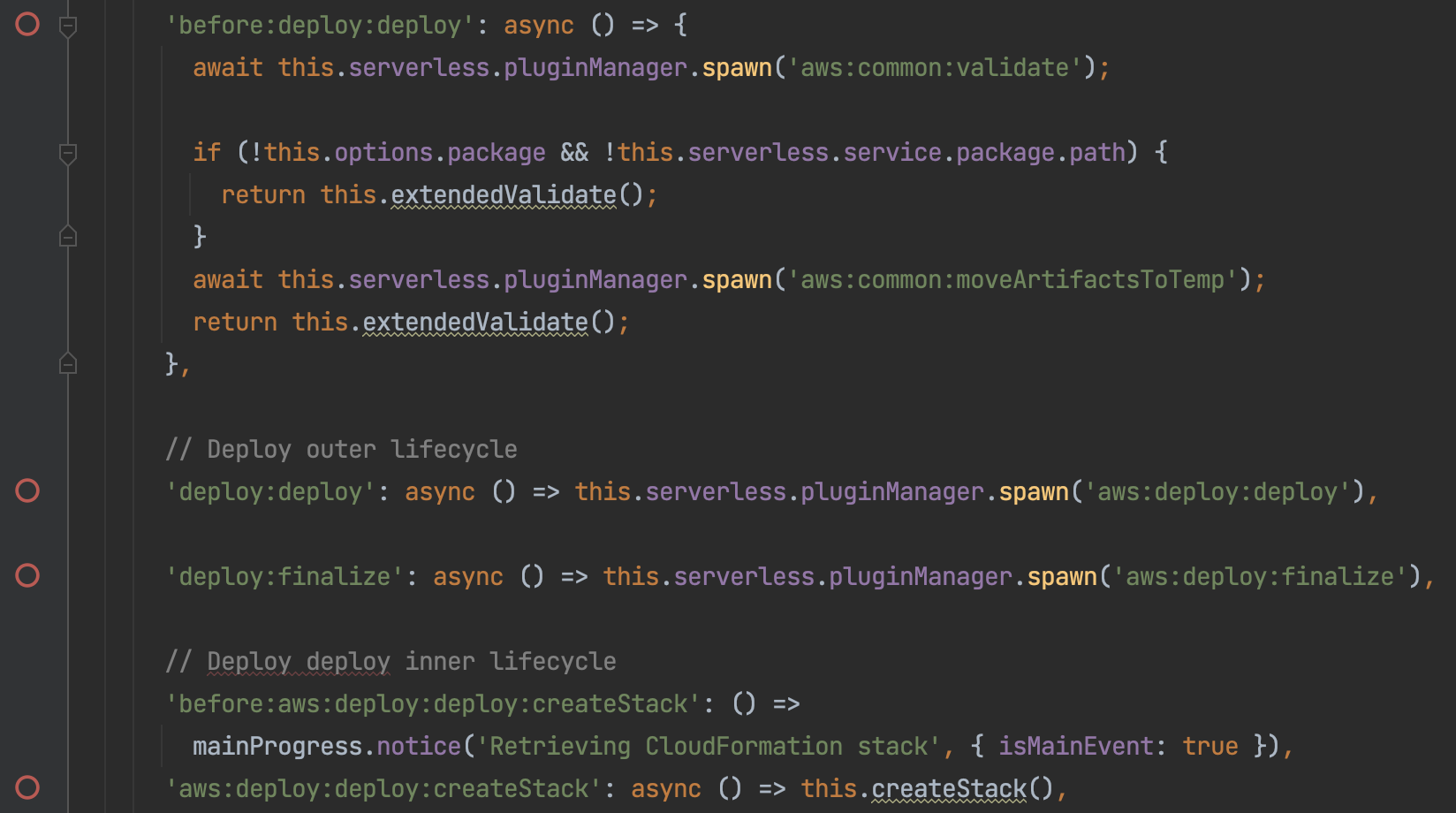 디버깅 도구를 이용하여 “serverless deploy 명령어 입력 → Serverless Framework 실행 → Serverless Framework 에러 발생” 에 해당하는 비즈니스로직이 어떤 코드에서 어떤 순서대로 처리되는지 분석하도록 하겠다.