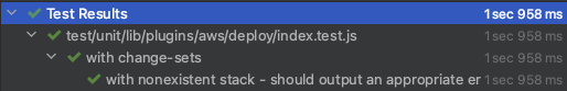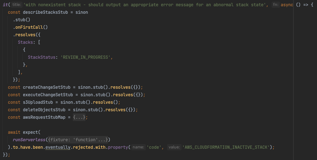 테스트 코드에서도 알 수 있듯이 describeStacksStub이 호출될 때, 반환값에 존재하는 StackStatus를 REVIEW_IN_PROGRESS 로 반환하도록 설정하였고, 아래에 있는 expect 구문에서 "AWS_CLOUDFORMATION_INACTIVE_STACK"에 해당하는 에러가 발생하는지 검증하도록 작성하였다.