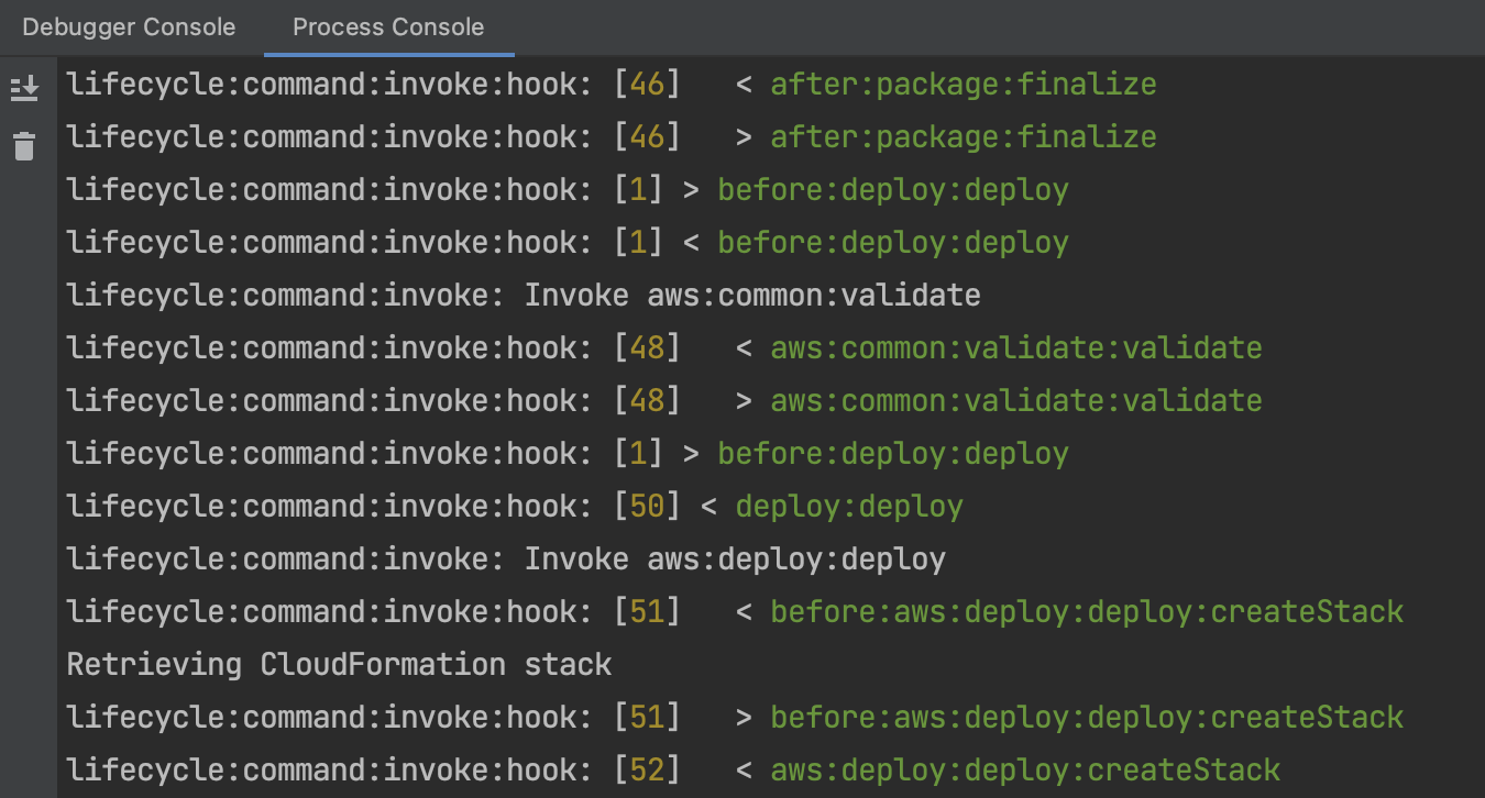 Process Console에서 Serverless Framework의 시작부터 종료될 때 까지 여러가지의 디버그 로그가 출력되는것을 확인할 수 있다.