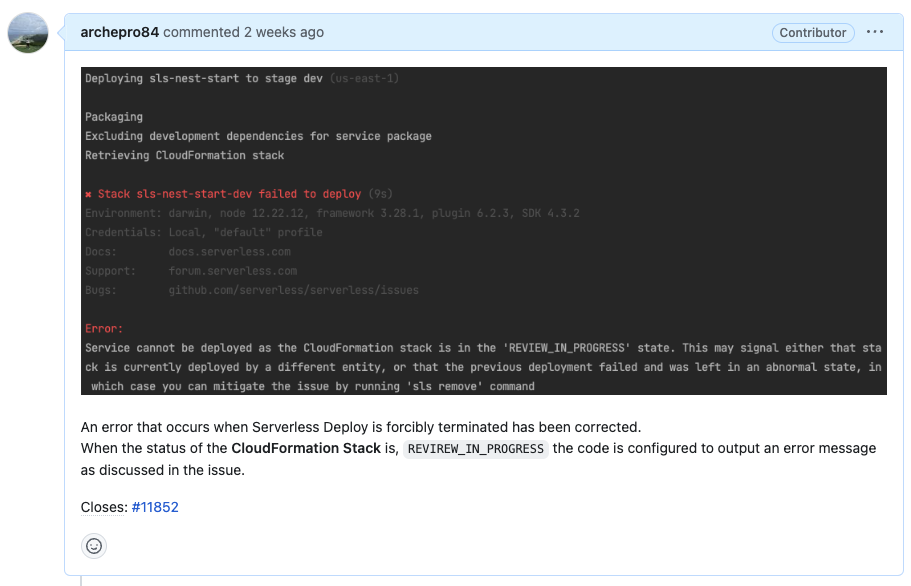 이전 글을 작성한 후 겪었던 오류 상황과 해결 방법, 그리고 동일한 문제가 발생하지 않도록 수정하는 방법을 정리하여 Serverless Github Issue에 제출하였는데, Repo 관리자와 수정 방안에 대해 의견을 나눈 뒤, Pull Request에 대한 요구를 받게 되었다.