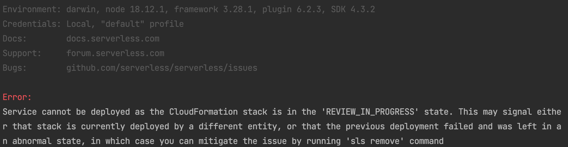 Serverless Framework의 배포 과정이 강제로 종료되면 AWS CloudFormation의 Stack이 비정상적으로 생성될 수 있고, 이 상태에서 다시 배포를 시도하면 “Stack … does not exist” 오류 메시지가 발생하게 된다.