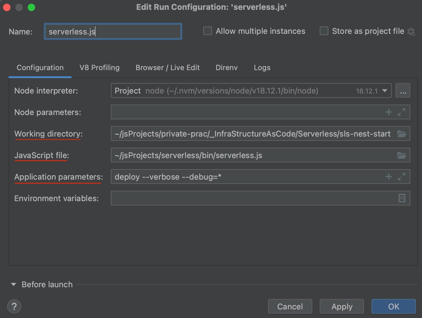 먼저, /bin/serverless.js 파일을 실행하도록 디버깅 환경을 구성했다. 또한, “Stack … does not exist” 에러가 발생하는 별도의 Serverless 프로젝트를 구성하고, 해당 디렉토리를 Working Directory로 설정하여 프로젝트를 실행하도록 구성했다. 마지막으로, 실행 순서를 명확하게 파악할 수 있도록 --verbose와 --debug 옵션을 추가하였다.