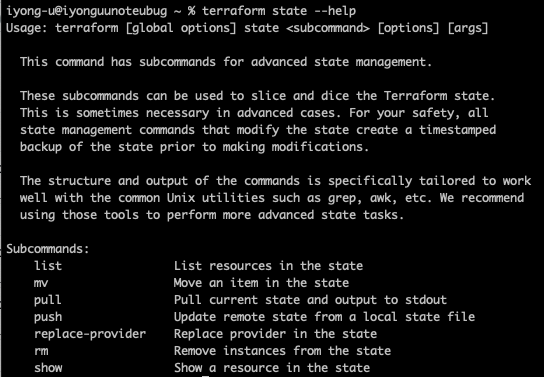 terraform state의 다양한 서브 커맨드는 terraform state --help 명령어를 이용하여 확인할 수 있다. 해당 명령어를 이용하여 .tfstate와 관련된 서브 커맨드를 확인해보자.
