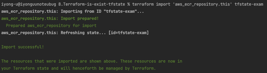위의 스크린샷은 terraform import 명령어를 실행한 후의 결과이다. 이로 인해, AWS에 배포되어 있던 ECR 저장소 정보를 성공적으로 가져올 수 있었다.