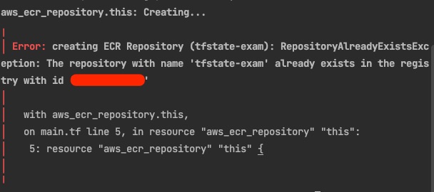 만약, “tfstate-exam” 이라는 이름을 가진 ECR 저장소가 이미 존재하는 상태에서 Terraform을 배포한다면 어떤 에러가 발생할까?
