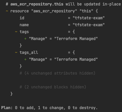 이제 .tfstate 파일에는 AWS 에 존재하던 ECR 저장소와 연동이 되었다는 것을 확인하였다. 이 상태에서 이미 구현되어 있던 코드에 추가적으로 Tags를 추가한다면, terraform plan은 어떤 결과를 도출할까? 확인해보자.