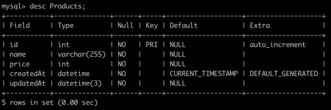 id: 기본키(Primary Key)이며, Auto Increment 설정을 가지고 있다.name: Product의 이름을 저장하는varchar타입의 컬럼이다.price: Product의 가격을 저장하는Int타입의 컬럼이다.createdAt: 데이터 생성 시간을 저장하는DateTime타입의 컬럼이다. 데이터 생성 시 현재 시간이 자동 저장된다.updatedAt: 데이터 수정 시간을 저장하는DateTime타입의 컬럼이다. 데이터 수정 시 현재 시간이 자동 저장된다.