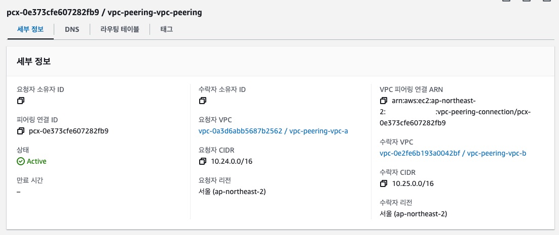여기서 Peering 수락 여부를 설정하지 않더라도, 상태 여부가 “활성”으로 설정된 것을 확인할 수 있는데, 이는 auto_accept 설정이 성공적으로 반영된 것을 확인할 수 있다.