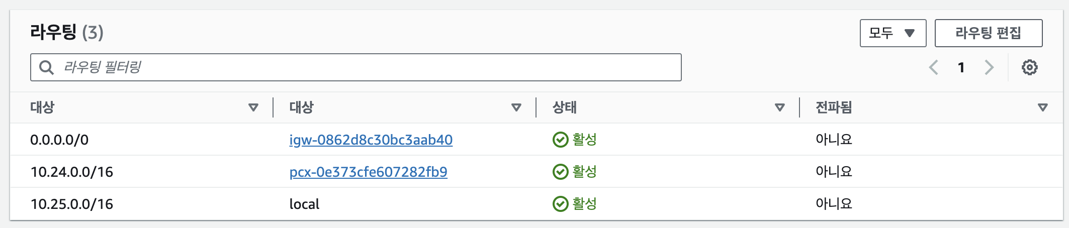 각 VPC에서 해당하는 Route Table을 확인하여, Terraform을 통해 설정한 라우팅 규칙이 제대로 적용되었는지 확인해보도록하자.