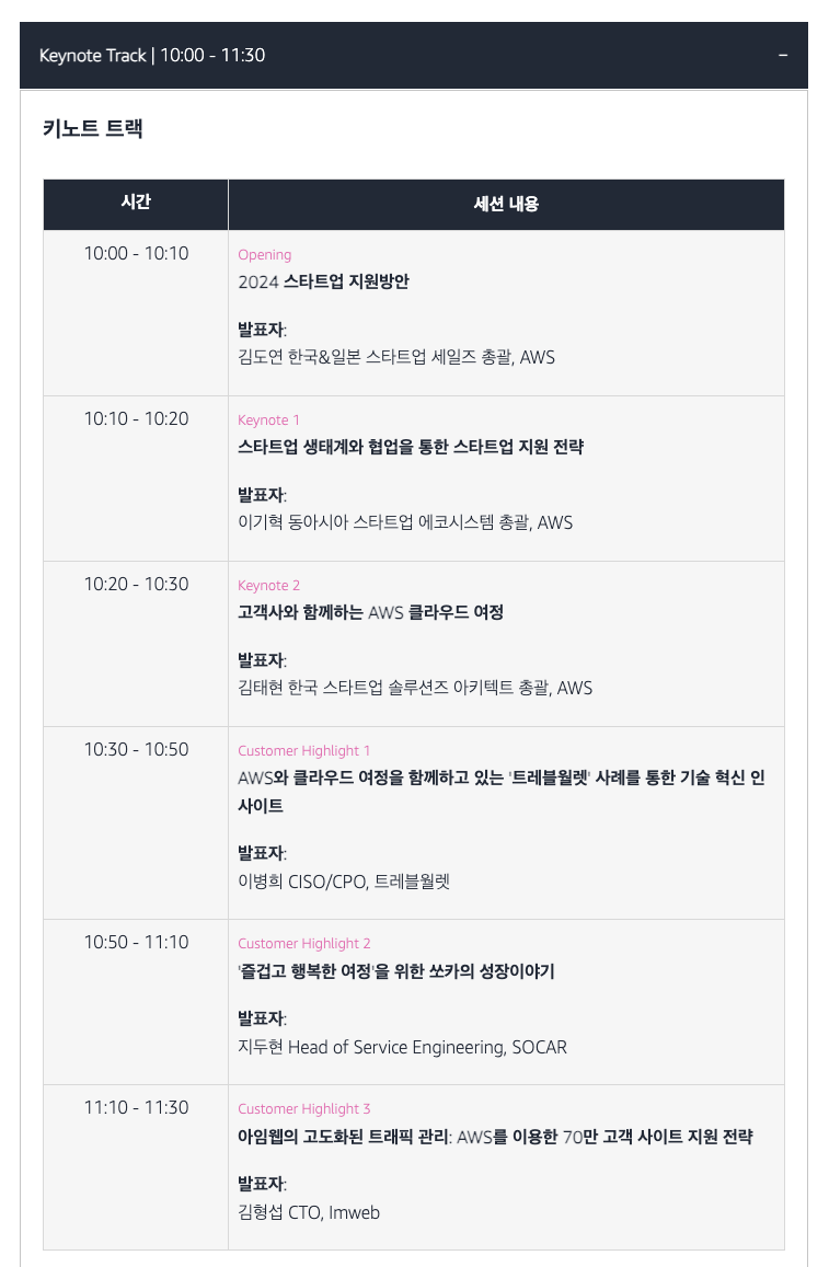 AWS Unicorn Day 2024는 다른 넥슨의 NDC나 네이버의 DEVIEW와 달리 모든 세션을 시간마다 선택하는 것이 아니라, 한개의 Track에 있는 모든 세션을 계속 듣도록 구성되었습니다.