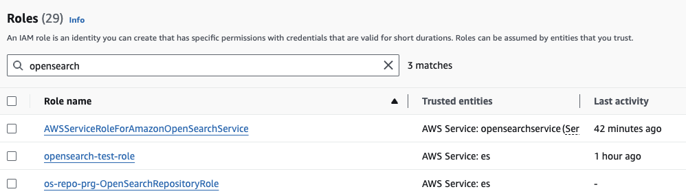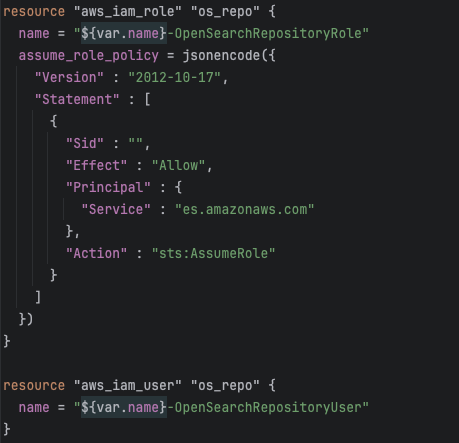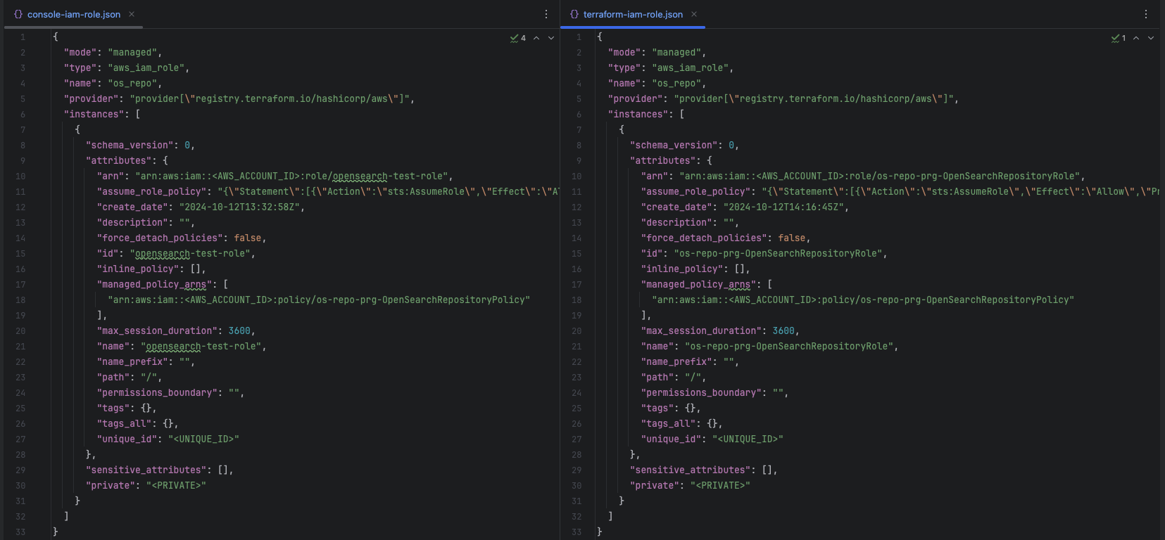 Terraform으로 생성하였을 때 일부 속성값이 누락된 것이 아닐까 하는 고민이 있었지만, 가장 확실한 방법을 두 Role을 상세하게 비교해보는 것이 가장 효율적이라고 판단하였다. Terraform으로 생성된 os-repo-prg-OPENSEARCHRepositoryRole과 AWS Console로 생성된 opensearch-test-role을 각각 Terraform으로 import하여 tfstate 파일에서 비교해보았다.