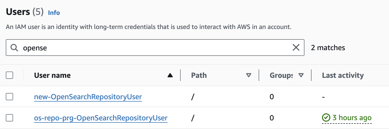 현재 사용 중인 os-repo-prg-OpenSearchRepositoryUser IAM User는 "RK70"에 해당하는 Access Key를 사용하고 있었으나, 새롭게 "7R4DB" Access Key를 발급받았다. 하지만, 변경된 Access Key를 사용하여 OpenSearch API를 호출하더라도 동일한 에러가 발생하였다.