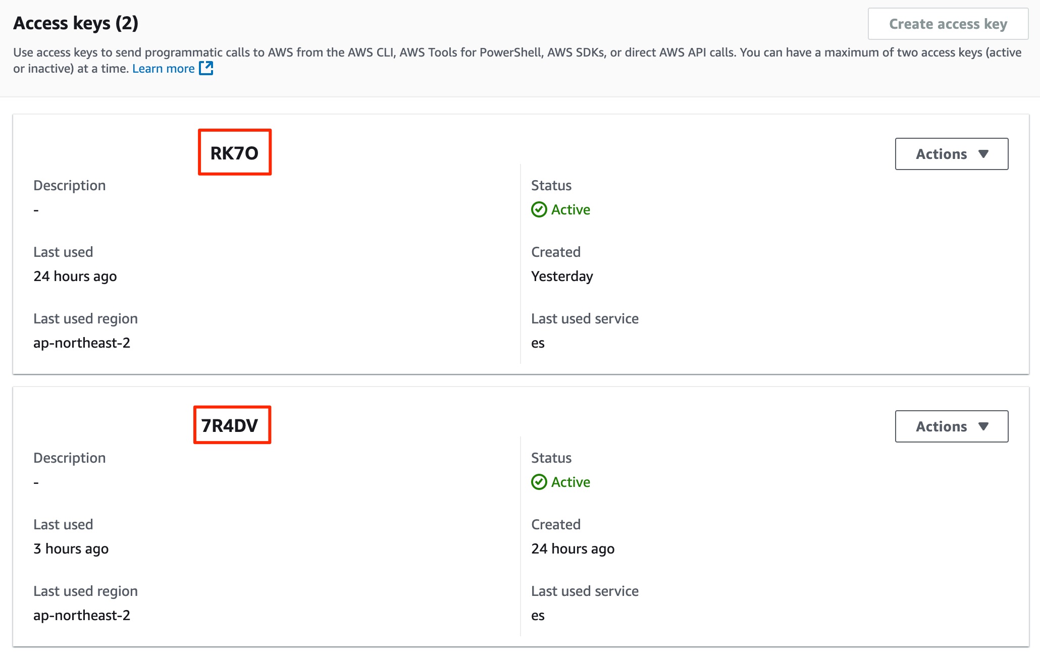 가장 먼저 OpenSearch API는 호출할 때 IAM User의 Access Key를 사용하는데, 잘못된 Access Key를 사용하고 있을 가능성을 염두에 두고 Access Key를 재발급 받아보았다.
