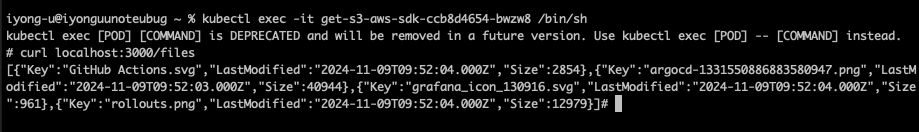 Pod 내에서 curl localhost:3000/files 명령을 실행하여 S3 Bucket의 파일 목록을 정상적으로 조회할 수 있었다. 이는 IRSA를 통해 Service Account가 IAM Role을 Assume 하여 필요한 권한을 획득하고, 이를 이용하여 S3 Bucket에 접근할 수 있었기 때문이다.