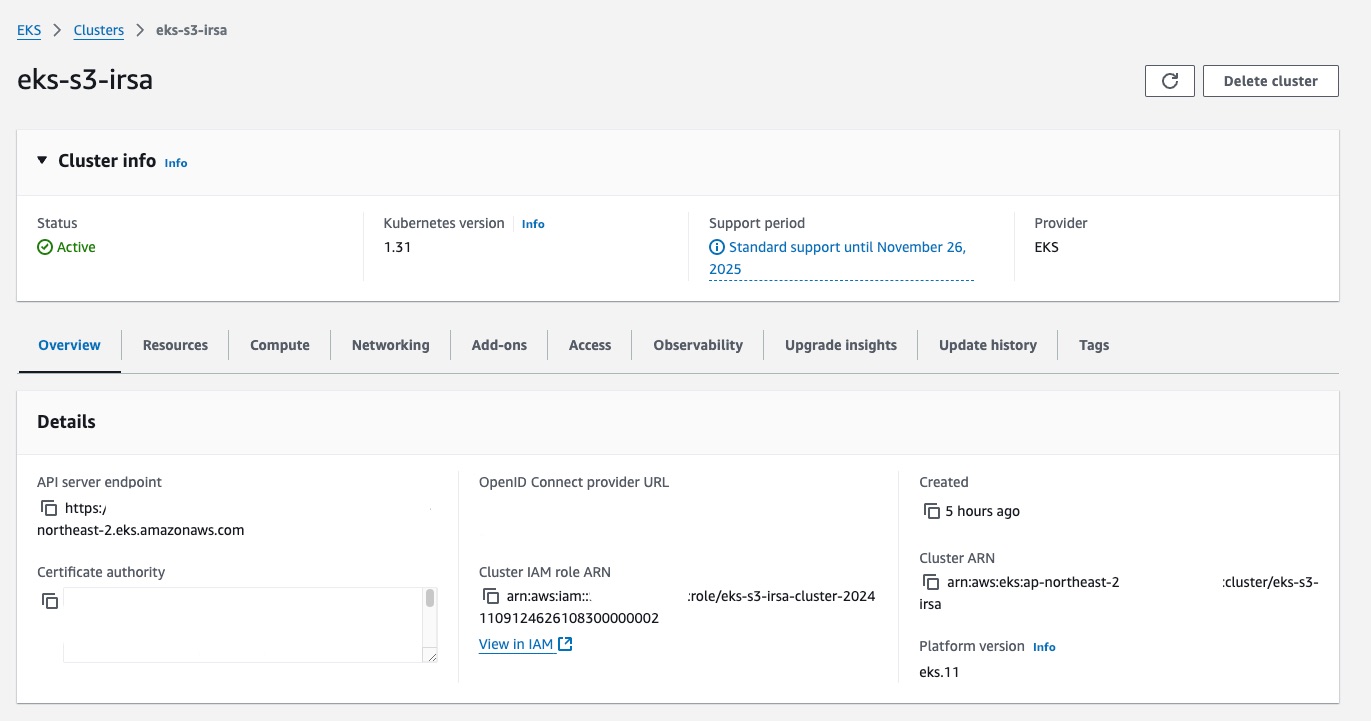 $ aws eks update-kubeconfig --region ap-northeast-2 --name eks-s3-irsa