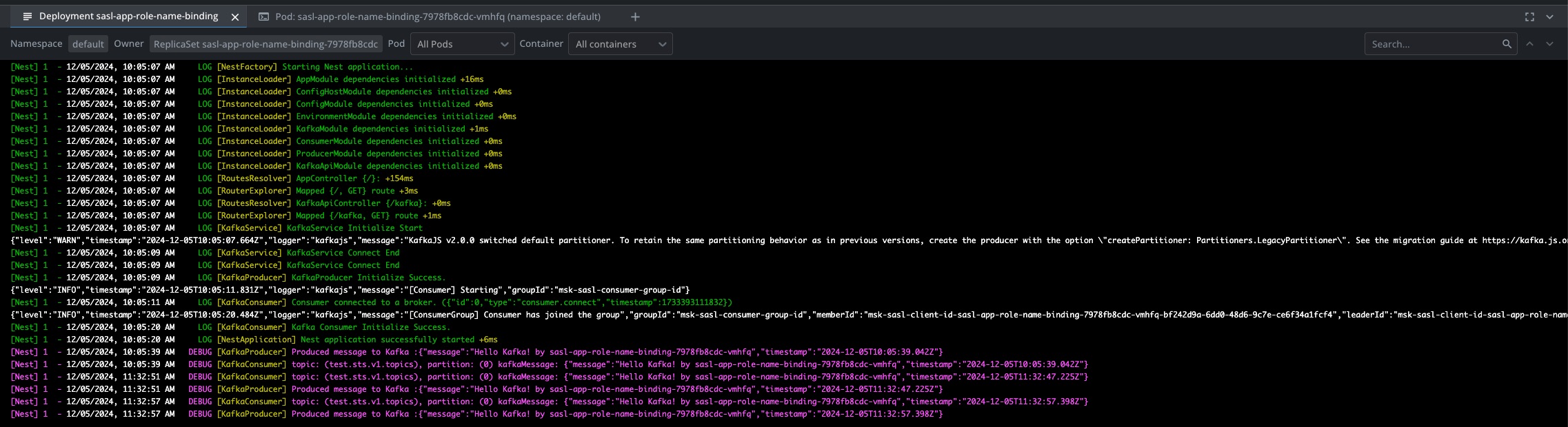 [SaslAuthenticator-OAUTHBEARER] SASL OAUTHBEARER authentication failed: Cannot change principals during re-authentication from IAM.arn:aws:sts::<AWS_ACCOUNT_ID>:assumed-role/MskSaslIRSARole/aws-sdk-js-session-1733388958898: IAM.arn:aws:sts::<AWS_ACCOUNT_ID>:assumed-role/MskSaslIRSARole/aws-sdk-js-session-1733392551401","broker":"b-1.msksasl.8b7568.c3.kafka.<REGION>.amazonaws.com:9098"}