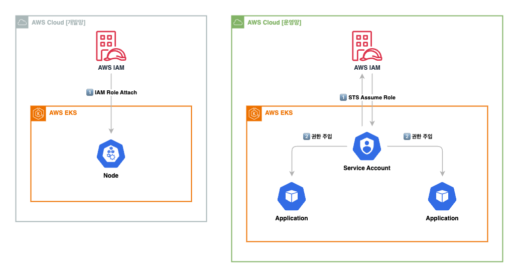 해당 이슈는 운영 환경에 어플리케이션을 배포한 이후 발생하게 되었다. 배포 당시 개발망과 운영망은 서로 다른 인증 방식을 사용하고 있었는데, 개발망에서는 Worker Node에 Role을 Attach 하여 인증을 수행하였지만, 운영망에서는 IRSA 기반 인증 방식으로 개선된 상태였다. 이는, 여러 작업이 함께 이루어지던 중 환경 통합이 되지 않았던 상황이었고, 운영망과 개발망 간의 마이그레이션이 완료되지 않던 상황에서 신규 어플리케이션이 배포되면서 문제가 발생하게 되었다.