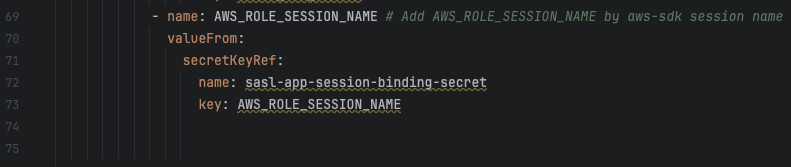 MSK 최초 인증 시점과 세션 갱신 시점에서 이름이 달라지는 문제가 원인이라면, STS 갱신 시 세션 이름이 변경되지 않도록 설정하면 문제를 해결할 수 있다고 판단하였다. aws-sdk는 내부적으로 세션 이름 고정 기능을 지원 하는데, AWS_ROLE_SESSION_NAME 환경 변수를 서버에 추가하게 된다면 Assume Role 요청 시와 세션 갱신 시 동일한 세션 이름을 사용할 수 있는 것을 확인하게 되었다.