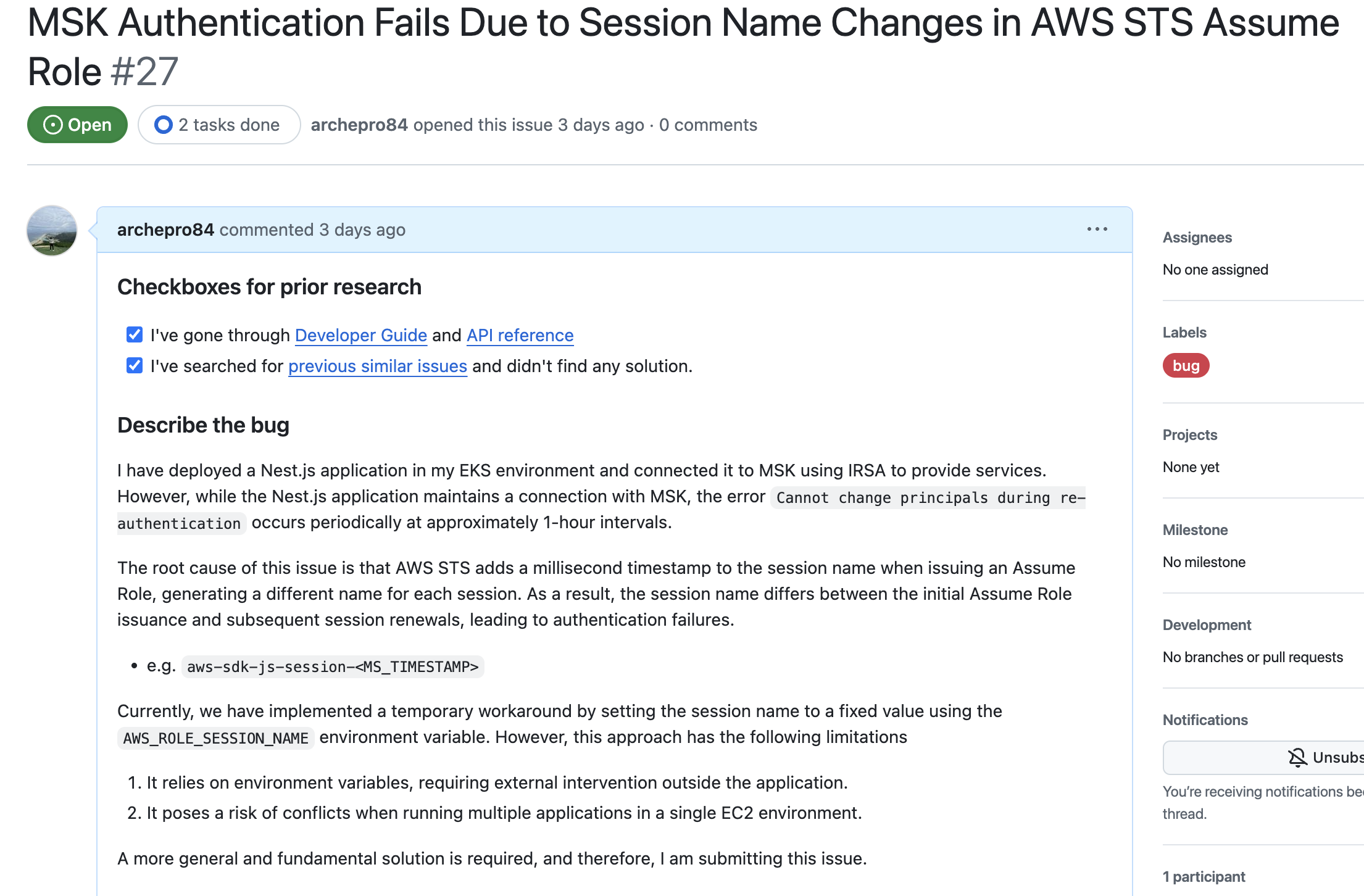 현재 MSK에서 SASL_OAUTHBEARER 메커니즘을 사용해 인증하려면 AWS Document에서 가이드 하는 것과 같이 aws-msk-iam-sasl-signer-js 라이브러리를 활용해야 한다. 이 라이브러리는 MSK와 IAM 기반 인증을 간소화하지만, 이번 세션 갱신 시 이름 불일치와 같은 상황에서는 이슈가 발생하게 된다.