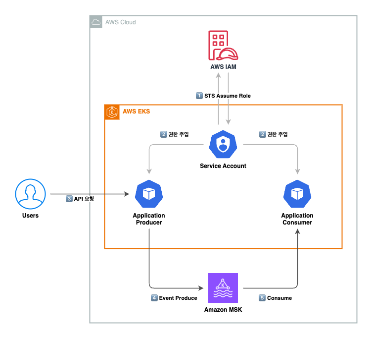 해당 서버들은 EKS 환경에 배포되어 있으며, MSA(MicroService Architecture) 형태로 구성되어 있다. 각 서버가 MSK와 연결 및 인증을 수행하기 위해서 IRSA(IAM Role for Service Account)를 이용하여 일시적으로 권한을 취득하는 방식으로 인증을 수행하고 있다.