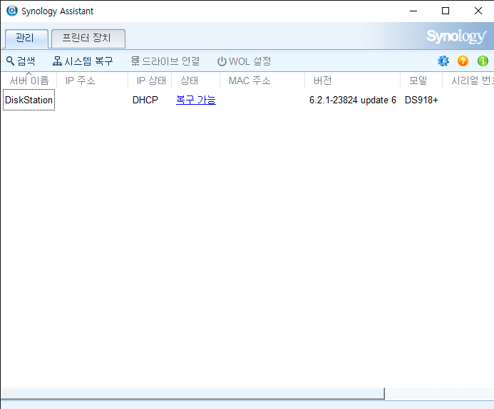 데스크탑에서 Synology Assistant로 DS918+ 네트워크에 연결되어있는 것을 확인하였습니다.
