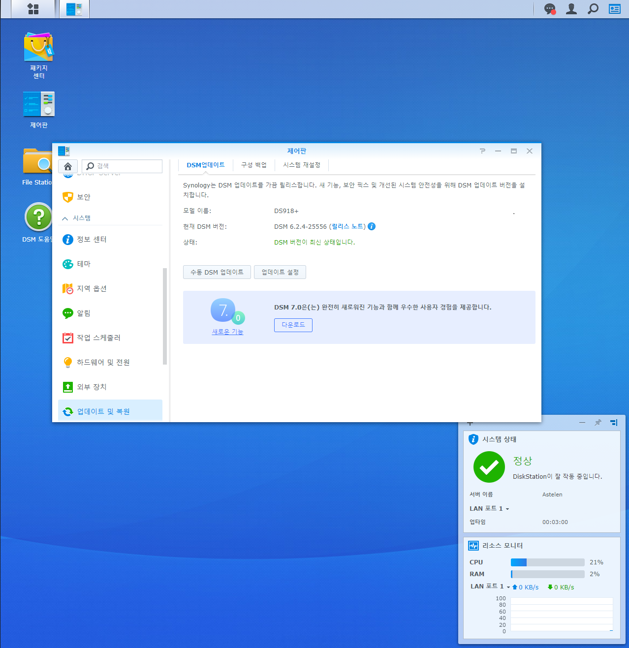 DSM7.0버전도 나왔으니 버전 업그레이드도 하면서 느긋이 진행하면 될 것 같습니다.